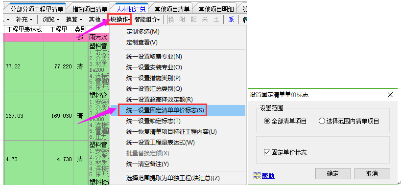如果清單全部要固定:需按上面操作完之后,再點擊塊操作下的統一設置固定清單單價標志功能。