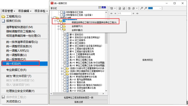 答:(1)項目工程中,點擊“項目管理”下拉選擇“統一打印”功能,進入報表打印界面。如下圖所示: