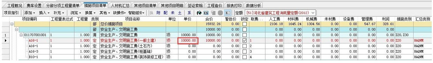 答:可以在措施項目清單界面通過鎖定功能實現將安全文明費設置為固定費用,即直接在定額行單價那輸入固定的數值。