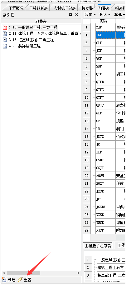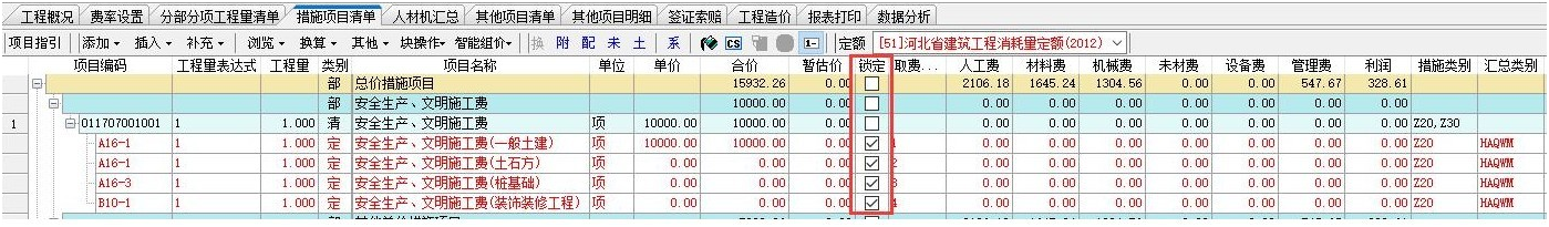 如果不希望文檔屬性或者費率重置的時候會將固定好的安全文明施工費再重置,則需要將所有的分專業的安全文明施工費的定額行都固定。如下截圖: