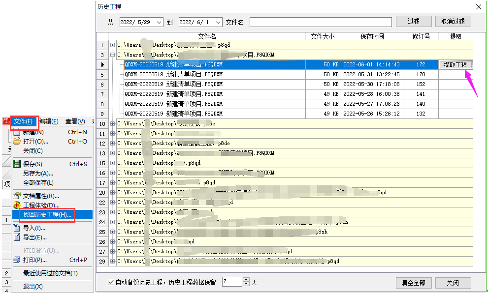 答:軟件提供找回歷史工程的功能,默認是保留七天以內的工程數據的。 點擊菜單欄文件下的找回歷史工程,在彈出的窗口找到對應工程點開加號,對照保存時間列找到相應時間點的工程,提取工程數據即可。如下所示: