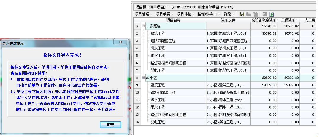 項目文件中含有的所有單位工程的內容實現了一鍵導入,包括了分部分項清單、措施項目清單和其他項目清單部分。 需要注意:EXCEL文件中需要有單項工程費匯總表及其對應的單位工程excel數據。(主要是為了保證按照相應的結構建立生成造價文件)