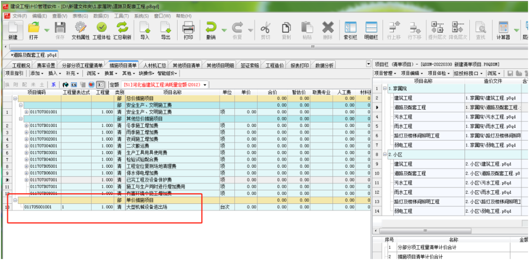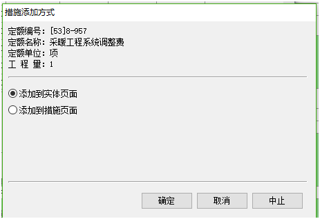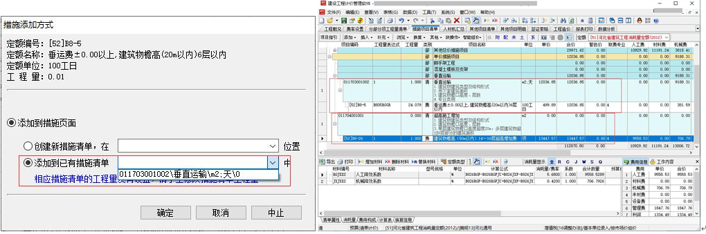 6)、點擊“確定”按鈕,由于當前工程為清單工程,系統自動將費用定額添加到措施頁面中對應措施項目下,如下圖: