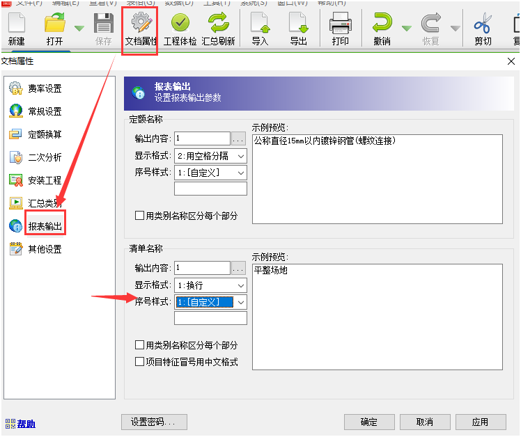 答:本身清單項目特征序號自動有默認排序,導入Excel版工程量清單之后項目特征序號出現了重復。 按照以下截圖,通過文檔屬性窗口的報表輸出功能,把序號樣式改成自定義即可。