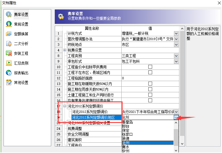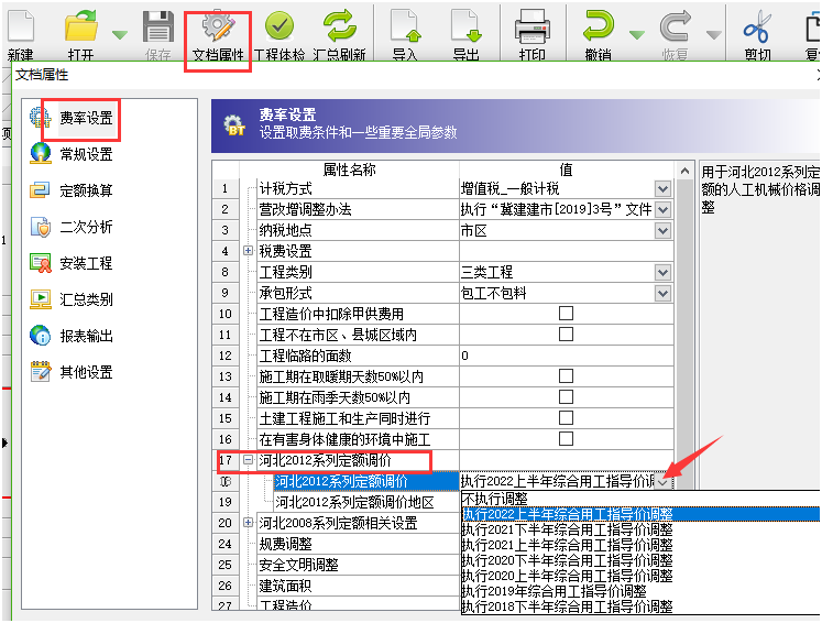 答:各地市出文件的時間不一致,大家使用的時候一定要更新到最新版本軟件程序。 更新到最新版本之后,點擊文檔屬性窗口,在默認的第一個費率設置界面可以切換選擇對應時間對應地市的人工指導價文件。如下截圖: