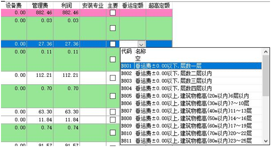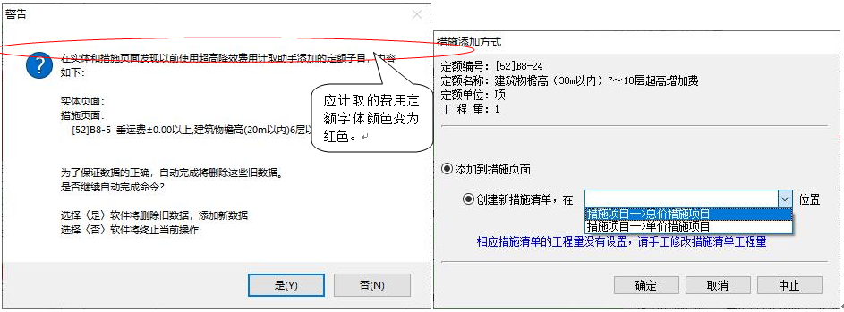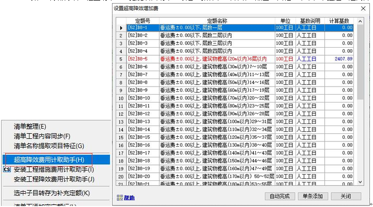 3)、執行該命令,彈出如下窗口,應計取的超高及垂運費用定額將變成紅色,其計取基數變成藍色。 4)、直接雙擊紅色定額行 或 點擊“單條添加”按鈕,可實現單條添加該項費用定額到當前選擇的位置。點擊“自動完成”按鈕,將自動添加當前工程所有的“垂運費”和“超高費”定額,點擊“自動完成”按鈕后,點擊自動完成,系統自動檢測工程中是否已經存在相關費用定額。如已經計取了相關費用,會進行提示。