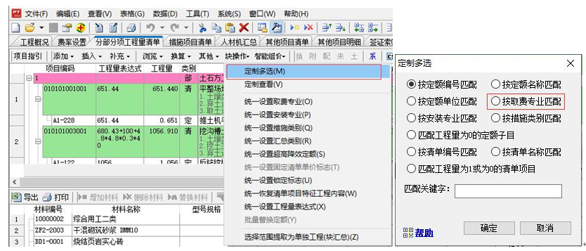2)、選擇多條定額子目,統一設置“超高垂運”標志 (1)手動按“Ctrl+左健”可選擇多條定額子目; (2)在“分部分項工程量清單”或者“預算表”界面,點擊“塊操作”下拉選擇“定制多選”,按取費專業選擇裝飾裝修專業點擊確定(這個選擇方法會一次把裝飾定額全部選擇中)。