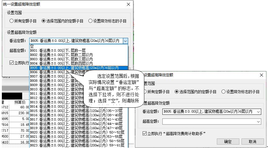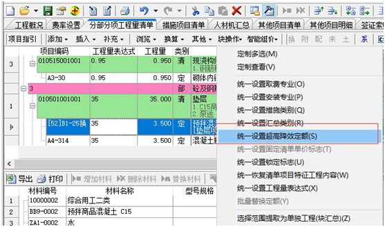 (3)通過“塊操作”下的“統一設置超高降效定額”功能,可對選中的定額進行統一設置超高降效標志。如下圖所示:
