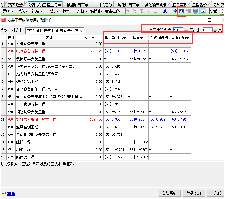 答:針對安裝專業的工程,咱們軟件提供了安裝工程措施費用計取助手(也就是CS按鈕)的功能,一鍵計取安裝專業的超高費、垂運費、腳手架搭拆費和系統調試費這四項費用。 注意功能操作之前不需要特意選中定額子目,軟件會自動識別到安裝定額庫各個分冊的子目,來自動統計基數,截圖如下: