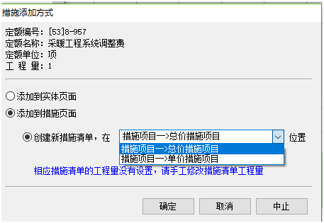 5)、執行該命令后,出現措施添加方式((定額計價傳統模式除外))。 (1)第一種:創建新措施清單,可選擇添加到單價措施或總價措施。如下圖所示: (2)添加到已有措施清單,直接下拉選擇對應清單。如下圖所示