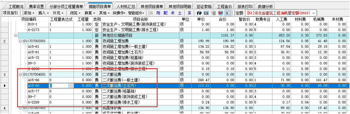 答:清單工程中在措施項目清單界面,根據需要可以進行刪減。例如,二次搬運費不需要計取了,可以直接刪掉或者清單和定額工程量同時改0。如下截圖: