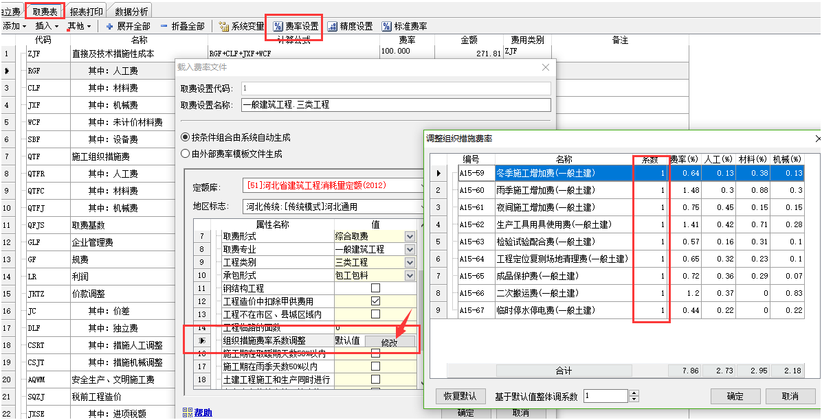 定額工程中,在取費表界面,點擊費率設置按鈕,可以通過修改組織措施費系數來實現。如下截圖: