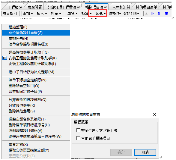 答:更新到最新版本之后,清單工程中如果安全文明或者總價措施修改了想要恢復到默認計取的狀態。可以在措施項目清單界面,點擊其他按鈕下的總價措施項目重置。